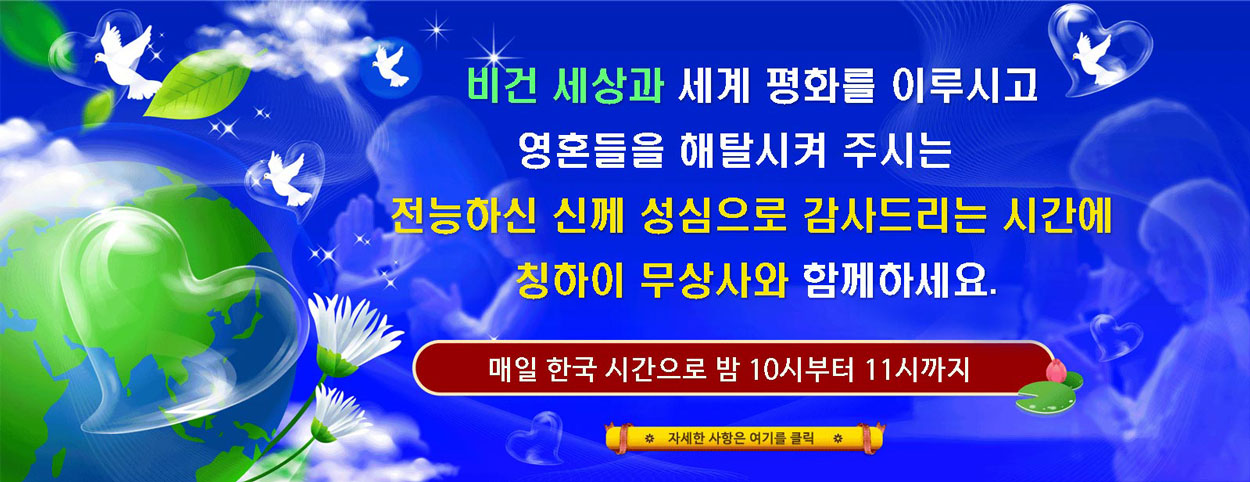 Featured Programs 더보기 더보기 48:17세계대전의 빠른 종결에 대해 우리가 감사드려야 할 존재, 2026년 4월 21일16:57마법의 책, 4부 중 1부3:25어머니 지구의 메시지를 전하고 스승님께 해탈가를 바치다7:35⭐ 종교 속의 관음 발자취 - 내면의 천국의 소리 명상, 3부 중 1부17:43우리 행성에 대한 오래된 예언 시리즈: 황금시대 예언 208부 - 도교의 위대한 성자인 스승, 노자(비건)의 재림에 관한 예언24:22『만물의 위대한 근원과 다시 하나 되기 위해 살아있는 스승을 찾으라』, 1부25:21칭하이 무상사(비건)의 노래와 작곡, 자작시, 공연, 다부작 중 24부5:35"비로자나 불"이셨던 스승님을 보다12:52COP27 참석자들에게 보내는 칭하이 무상사 메시지24:26황금시대 예언35부-미륵불과 용화회상 더보기